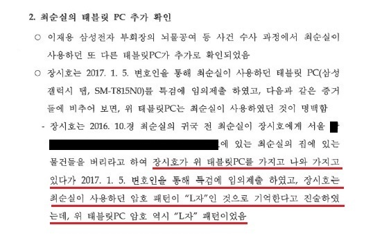 “The L-shaped lock pattern was not originally set on each tablet and was found to be a product of evidence tampering, however. The lock pattern was set after each device was obtained by JTBC and Special Prosecutors Yoon Seok-yeol and Han Dong-hoon to make it appear as if they belonged to Choi Seo-won,” Byun added.