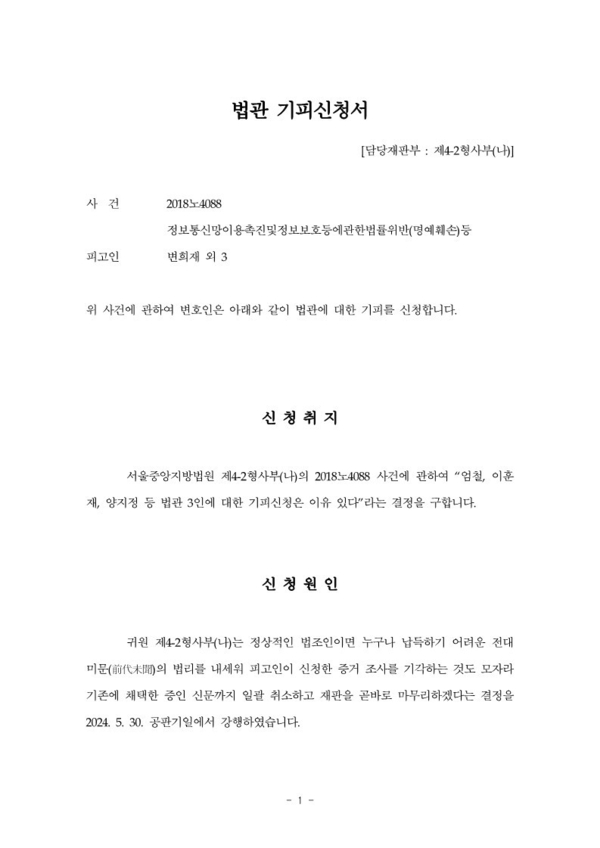 지난 15일, 미디어워치 측 법률대리인 이동환 변호사는 법관 기피신청서를 통해 “증거재판주의를 비롯해 무기대등의 원칙, 피고인 우선주의 같은 원칙에 따라 대한민국 국민으로서 마땅히 누려야 할 방어권 보장을 제4-2형사부(나)에서는 더 이상 기대할 수 없다는 점을 확인했다”며 “서울중앙지방법원 제4-2형사부(나)의 2018노4088 사건에 관해 ‘엄철, 이훈재, 양지정 등 법관 3인에 대한 기피신청은 이유 있다’라는 결정을 구한다”고 말했다.