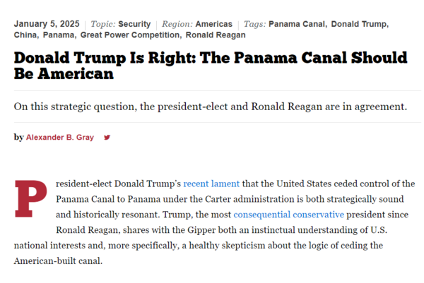 칼럼은 로널드 레이건 이후 가장 영향력 있는 공화당 대통령인 트럼프가 파나마 운하 운영권 회수를 주장하고 있는 배경에는 미국의 국익에 대한 본능적인 이해와 미국이 건설한 운하를 파나마에 넘겨주는 행위에 대한 ‘건강한 회의론(healthy skepticism)’이 존재한다고 지적했다.