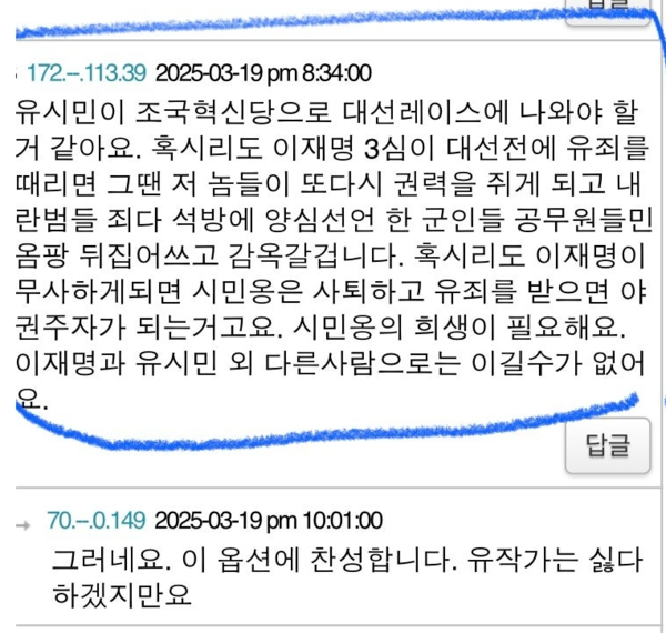 이 소식이 전해지자 미시USA 등 친 이재명 커뮤니티에서도 만약 이재명 대표가 법원의 당선무효형 등으로 출마가 불가능해지면 유시민 작가를 대통령으로 밀자는 여론이 들끓고 있다.
