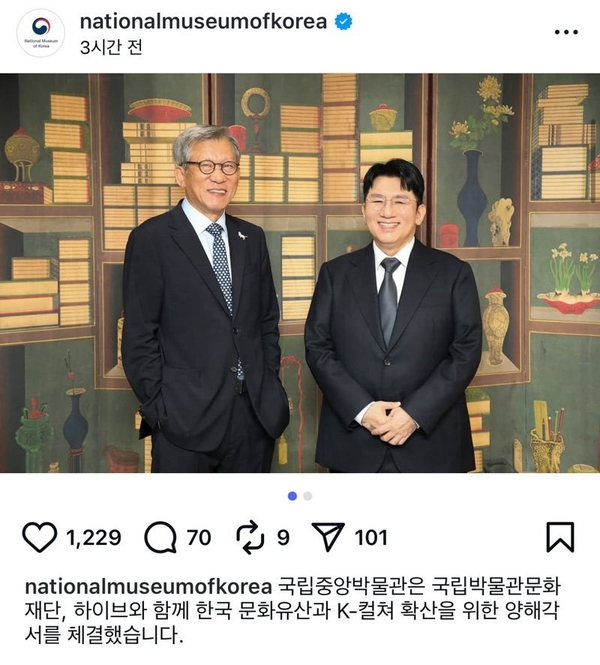 지난 1일 국립중앙박물관은 한국 문화유산과 대중음악을 연계한 뮷즈(뮤지엄+굿즈) 개발과 해외 진출 추진을 한다는 내용으로 MOU를 맺었다며 유홍준 관장과 방 의장이 웃는 사진을 공식 계정에 올렸다.