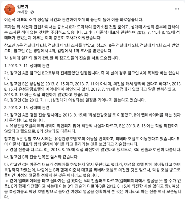 김연기 변호사는 "이준석 대표의 소위 성상납 사건과 관련하여 허위의 풍문이 돌아 이를 바로잡는다"면서, "혹자는 위 사건과 관련하여서는 공소시효가 도과하여 불기소된 것일 뿐이고, 성매매 사실의 존부에 관하여는 조사된 적이 없는 것처럼 주장하고 있는데, 그러나 이준석 대표와 관련하여 2013년 7월 11일과 8. 15.에 성매매가 있었는지 여부는 이미 충분히 조사가 이뤄졌다"고 밝혔다.