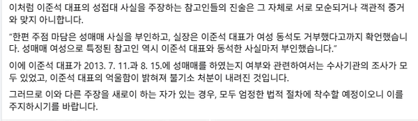 또 김 변호사는 이 대표 성접대 관련 주점 마담이 성매매 사실을 부인했고, 실장도 이 대표가 여성 동석도 거부했다고 확언하고 성매매 여성으로 특정된 참고인 역시 이 대표와 동석한 사실마저 부인했다는 것을 거론하며 "이에 이준석 대표가 2013년 7월 11일과 8월 15일에 성매매를 하였는지 여부와 관련하여서는 수사기관의 조사가 모두 있었고, 이준석 대표의 억울함이 밝혀져 불기소 처분이 내려진 것" 이라고 지적했다.