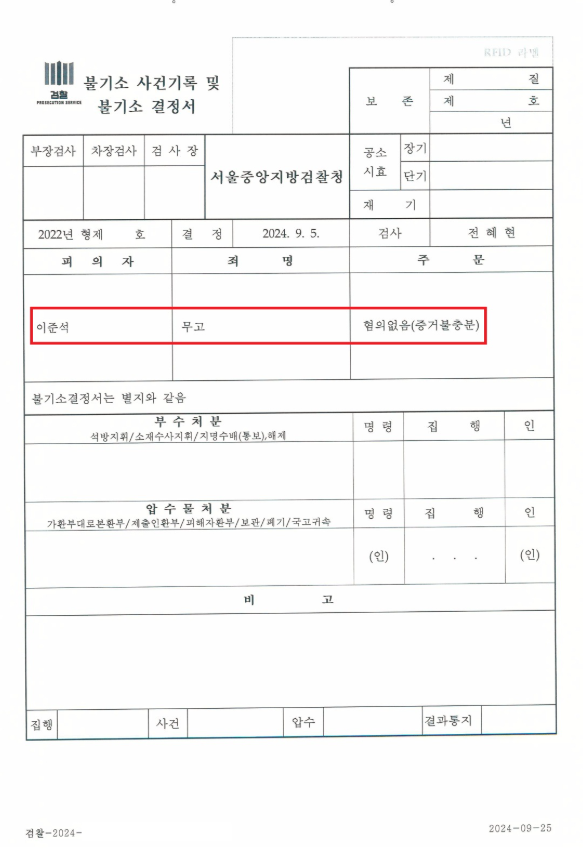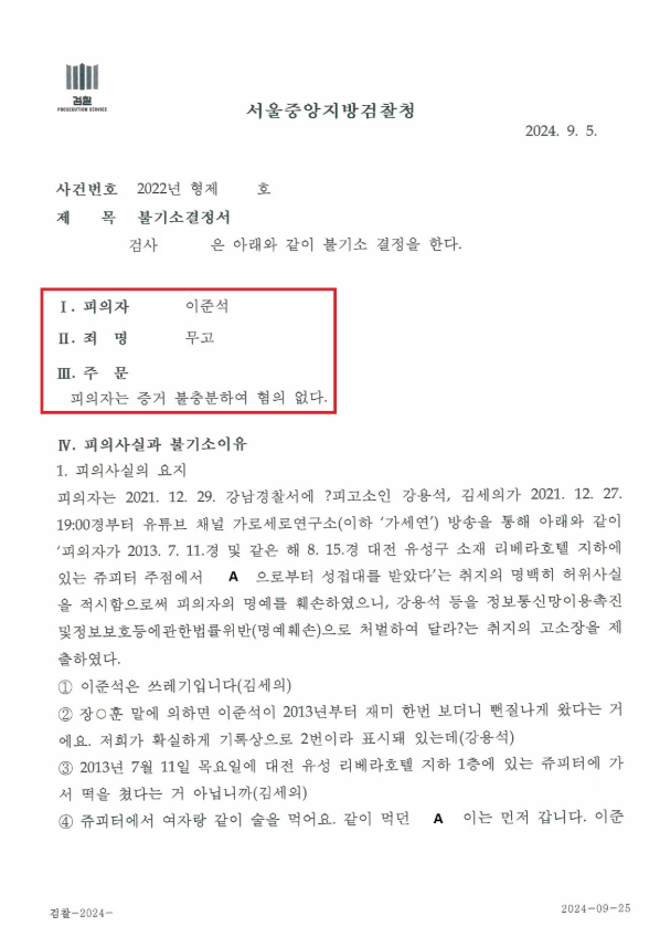 "이처럼 이준석 대표의 성접대 사실을 주장하는 참고인들의 진술은 그 자체로 서로 모순되거나 객관적 증거와 맞지 아니한다"고 강조했다.