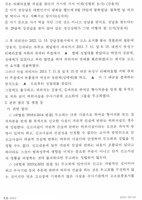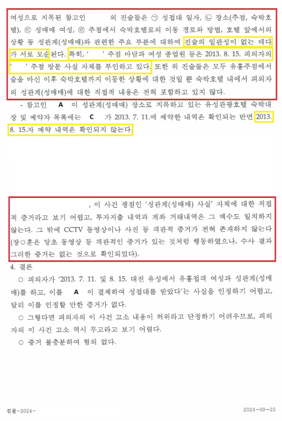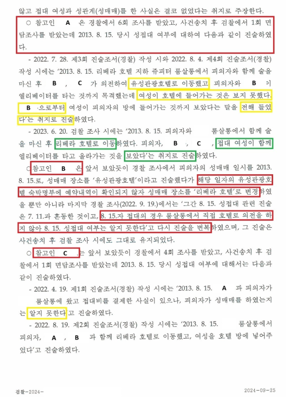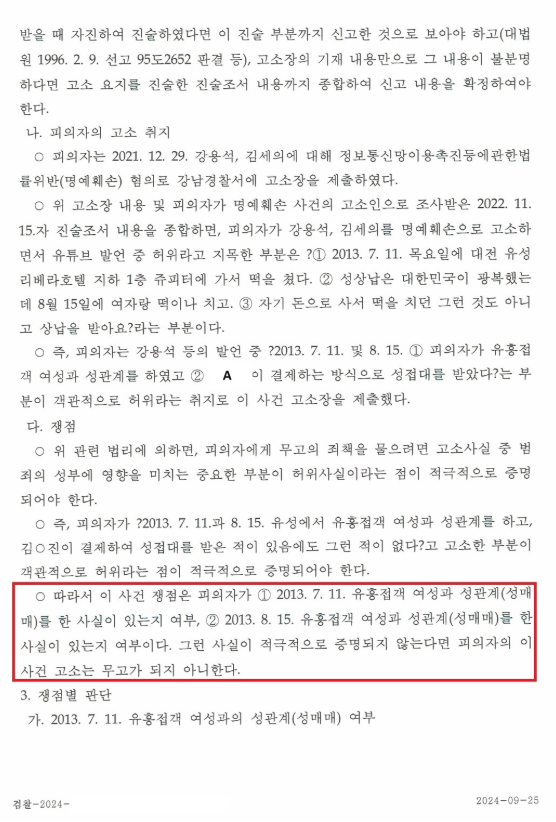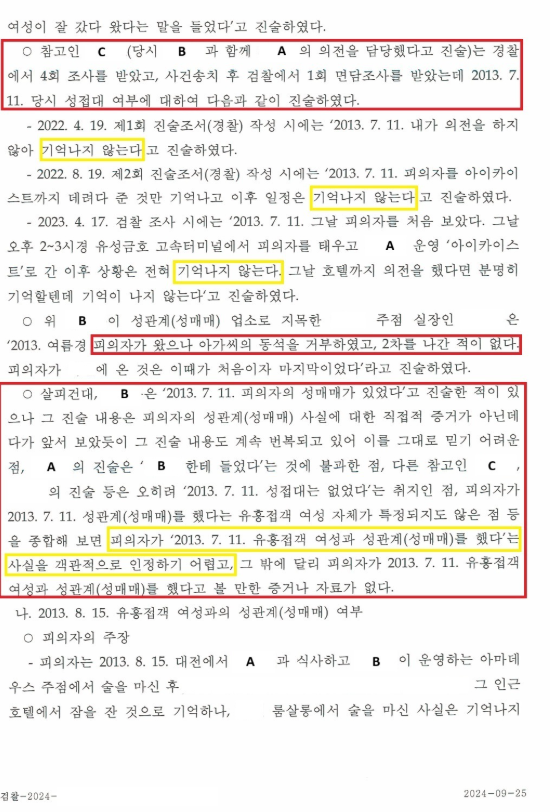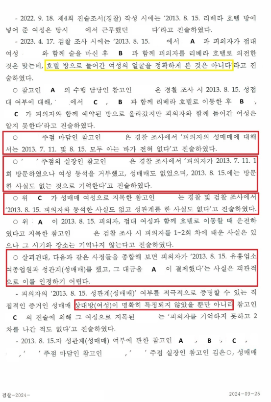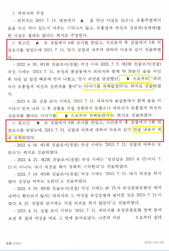 이어 김 변호사는 2013년 7월 11일 성매매와 관련해 "구체적으로 참고인 A은 참고인 B으로부터 전해들었다는 입장이고, 이 날의 경우 참고인 A이 목격한 바는 없었고 참고인 B은 성상납이 2013년 8월 15일이고 2013년 7월 11일이 아니며, 의전을 해서 명확히 안다고 하다가 2013년 8월 15일자 유성관광호텔의 예약내역이 확인되지 않자 2013년 7월 11일에 성접대가 있었다고 말을 번복하였고, 2013년 8월 15일에는 직접 의전하지 않았다고 했고 참고인 C는 그해 7월 11일 (성접대가 의심되는) 일정은 기억나지 않는다고 말했다"고 지적했다.