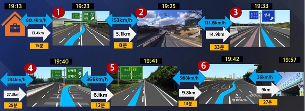 가장 충격적인 구간은 구룡터널 부근 두 곳이다. 내곡동에서 개포동 지점까지 6.1km를 1분 만에 통과했다. 시속 366km로, 우리나라가 자체 제작한 KTX의 최고 속도다. 더 놀라운 것은 개포동 지점에서 경부고속도로 양재IC까지 9.8km 구간이다. 이 구간 역시 1분 만에 통과했다. 시속 588km다. 이는 유턴 구간까지 포함된 시내 도로에서 나온 수치다.
