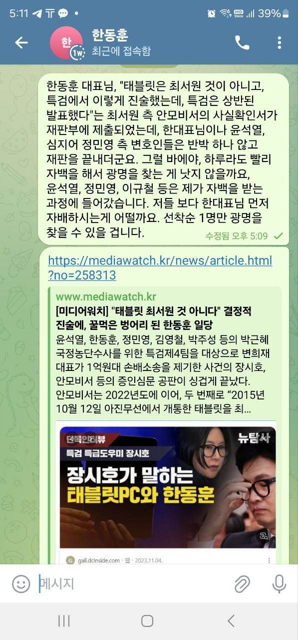 한편, 변 대표는 태블릿 조작의 주범인 한동훈 전 국민의힘 대표에게도 문자와 텔레그램을 통해 “자백하라”는 메시지를 보냈다.