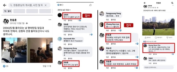 한동훈은 이명박 정부 시절 청와대 파견 선임행정관을 지내며 가장 잘나가던 시절을 보냈다. 청와대 지붕 위 고양이 사진을 페이스북에 올리며 행복했던 시절을 회고했다. 박근혜 정부 들어서는 계속 과거를 그리워하는 글을 올렸다. 2013년 5월에는 "2004년 뉴욕이 있을 때"라며 유학 시절을 회상했다. 2013년 12월에는 또다시 뉴욕 시절 사진을 올렸고, 이창수 검사는 "짠~~~~합니다"라고 댓글을 달았다. 한동훈은 "그냥 살자"라고 쓴 댓글에 "ㅎㅎ 우리 그냥 살자"고 답했다.