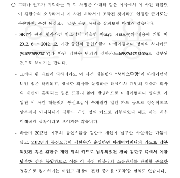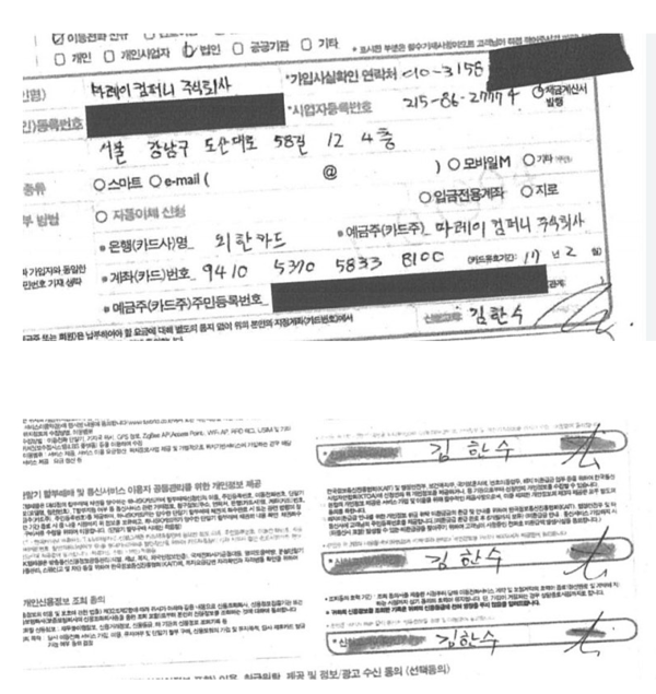 더구나 태블릿 계약서에 마레이컴퍼니 회사카드 번호로 자동결제 하도록 적혀있음에도, 실제 카드회사에서는 자동결제 체결된 기록조차 없다. 당연히 요금납부도 전혀 되지 않았다. 이것은 사후에 마레이컴퍼니 회사에서 자동납부된 것처럼, 계약서를 위조한 것 말고는 달리 설명할 길이 없다.