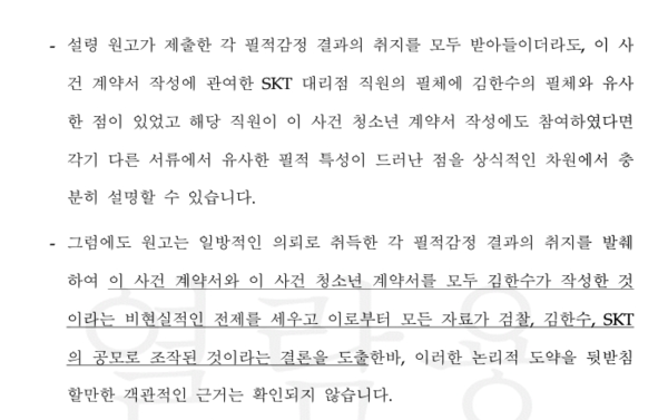 필적만 같은 게 아니라 계약서의 싸인은 김한수의 싸인과 똑같다. 우연히 대리점의 직원이 김한수와 필체가 비슷하고, 김한수의 싸인과 똑같이 쓸 확률이 대체 얼마인가. 더구나 계약서 작성 현장에서 김한수의 위임장을 들고 간 김성태 직원이 있었다. 김성태 직원 앞에서 누군지도 모를 대리점 직원이 김한수의 필적을 흉내내고, 같은 싸인으로 1면 계약서를 작성한다는 게 말이 되나. 그 중요한 1면 계약서는 대리점 직원이 작성하고, 2, 4, 5면은 대리인 김성태가 작성했단 말인가. 10여년간 휴대폰 대리점 사업을 해온 전문가 안씨는 서부지법에서의 재판에서, “저런 계약서가 SKT 본사 서버에 입력되는 것은 불가능하다. 반드시 수정하라는 지침을 대리점에 내리게 된다”고 증언했다. 이에 대해서 검찰측은 전혀 반박하지 못하고 있다.