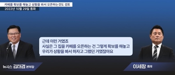 결정적 대화는 그다음에 이어졌다. 김태겸이 말했다. "근데 이런 거였죠. 사실은 그 집을 카페로 오픈하는 건 그렇게 확보를 해놓고 우리가 상황을 봐서 하자고 그랬던 거였잖아요." 이세창은 "그것도 이런 저런"이라며 동의했다.