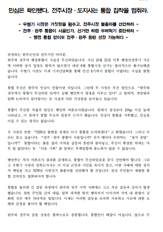그러면서 "우범기 시장과 전북도지사는 더 이상 군민과 시민을 속이지 말고, 이번 사태에 대한 정치적 책임을 지고 2026년 지방선거 불출마를 선언해야 할 것"이고, "주민들이 제출한 통합 건의안도 철회되어야 한다"고 밝혔다.