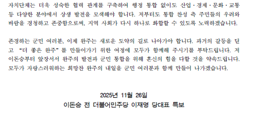 이어 "저부터도 통합 찬성 측 주민들의 우려와 바람을 경청하고 존중함으로써, 지역 사회가 다시 하나로 화합할 수 있도록 노력하겠다"면서, "모두가 자랑스러워하는 희망 찬 완주의 내일을 군민 여러분과 함께 만들어 나가겠다"고 밝혔다.