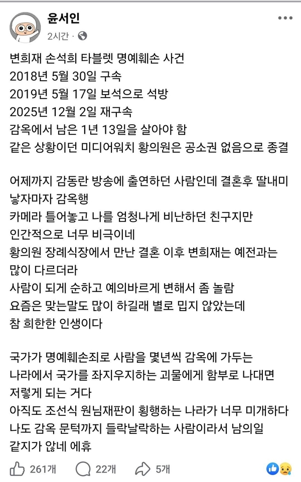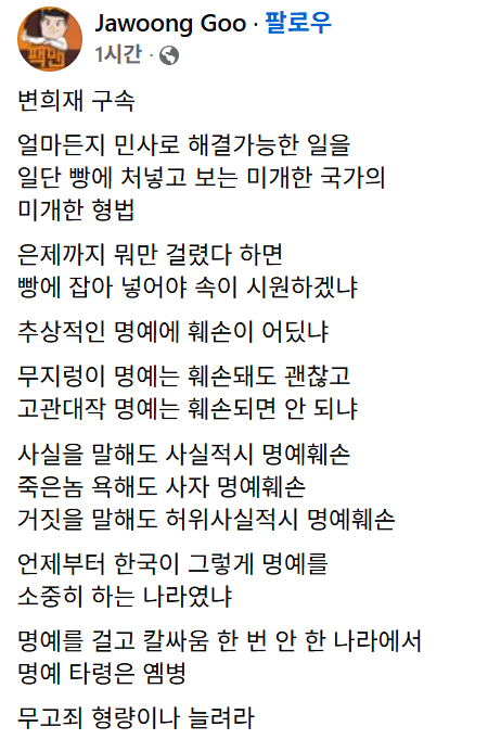 만화가 윤서인 씨는 지난 2일 페이스북에 변 대표 구속 소식을 전하며 “국가가 명예훼손죄로 사람을 몇년씩 감옥에 가두는 나라에서 국가를 좌지우지하는 괴물에게 함부로 나대면 저렇게 되는 거다”라며 “아직도 조선식 원님재판이 횡행하는 나라가 너무 미개하다. 나도 감옥 문턱까지 들락날락하는 사람이라서 남의 일 같지가 않네 에휴”라고 한탄했다.