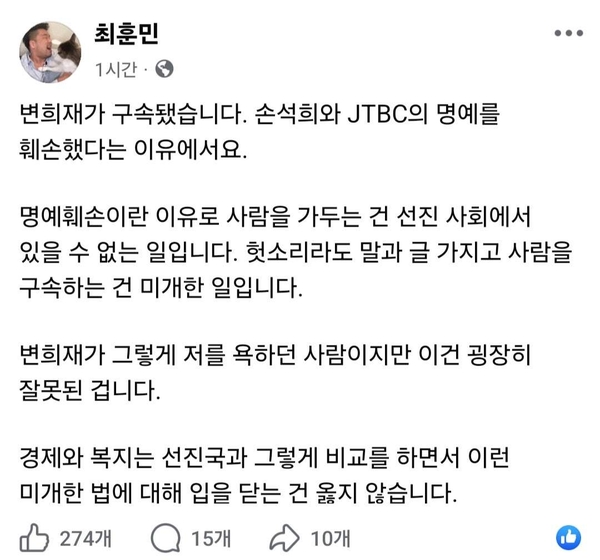 같은 날, 최훈민 매일신문 기자 역시 페이스북에 “변희재가 구속됐습니다. 손석희와 JTBC의 명예를 훼손했다는 이유에서요”라고 전하며 “명예훼손이란 이유로 사람을 가두는 건 선진 사회에서 있을 수 없는 일입니다. 헛소리라도 말과 글 가지고 사람을 구속하는 건 미개한 일입니다”라고 질타했다.