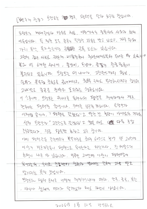 미국민 20만명 이상이 평택ᄄᆞᆼ에 들어오는데, 수시로 친중반미 집회가 벌어지는 한국에 그냥 믿고 맡기지는 못할 것입니다. 트럼프와 평택 문제를 어떻게 해결하느냐에 따라 한국, 중국, 북한, 아시아 전체의 미래가 달려있다 해도 과언이 아닙니다. 2026년 1월 12일 남부구치소
