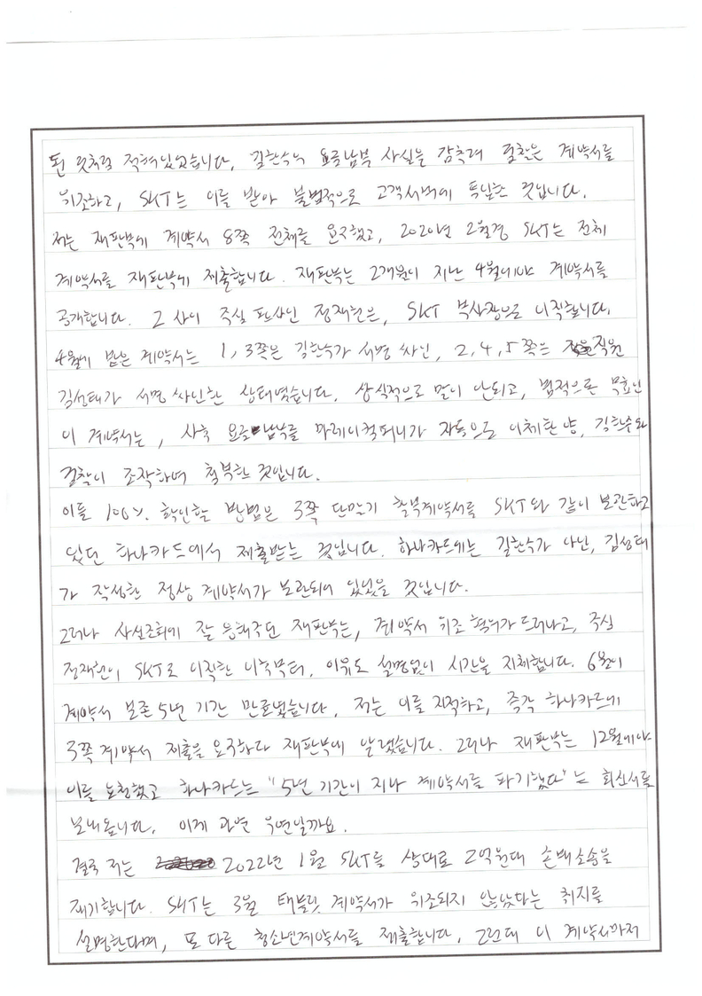 그러나 재판부는 12월에야 이를 요청했고 하나카드는 “5년 기간이 지나 계약서를 파기했다”는 회신서를 보내옵니다. 이게 과연 우연일까요. 결국 저는 2022년 1월 SKT를 상대로 2억원대 손배소송을 제기합니다.