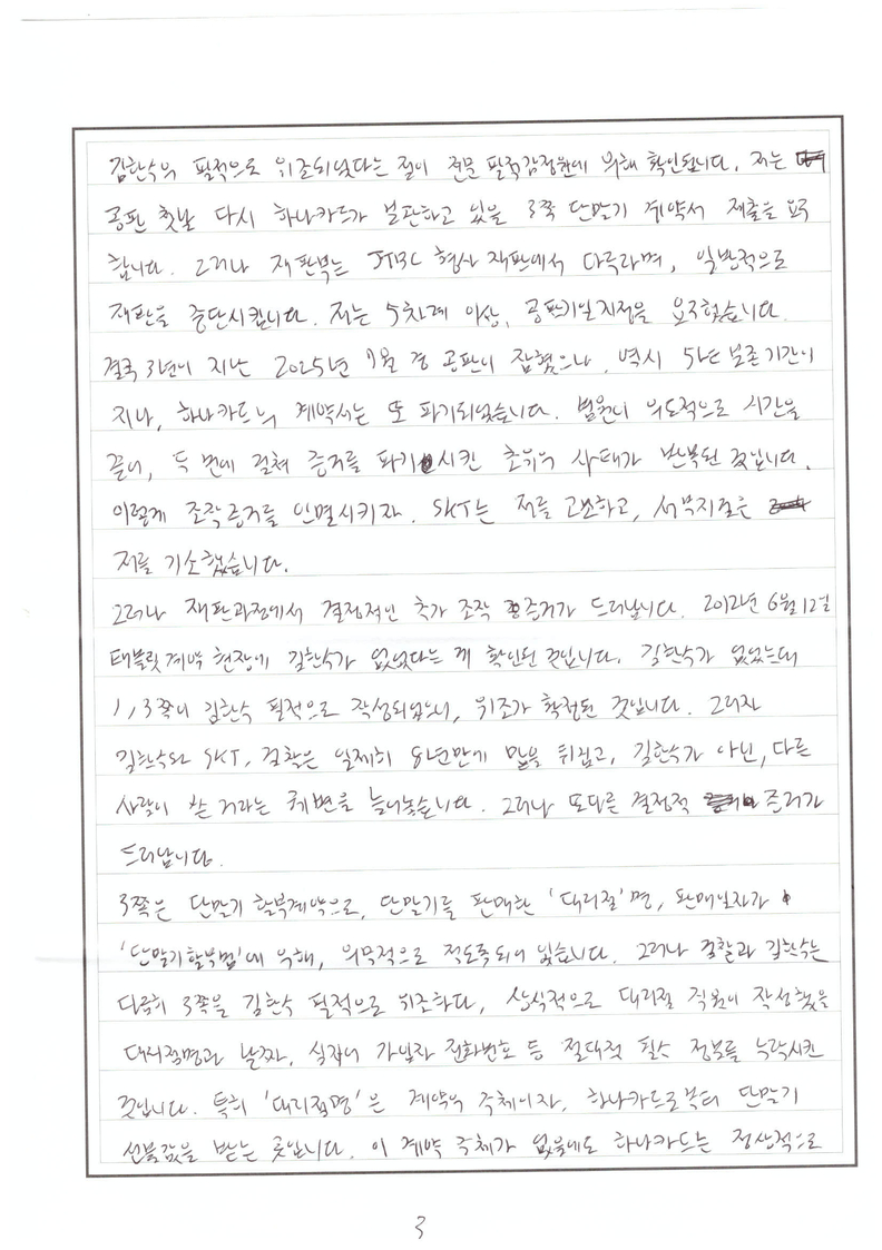 저는 재판부에 계약서 8쪽 전체를 요구했고, 2020년 2월경 SKT는 전체 계약서를 재판부에 제출합니다. 재판부는 2개월이 지난 4월에야 계약서를 공개합니다. 그 사이 주심 판사인 정재헌은 SKT 부사장으로 이직합니다.