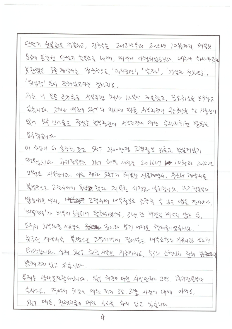 문제는 남대문경찰서입니다. SKT 해킹에 대한 시민단체의 고발, 과기정통부의 수사의뢰, 계약서 위주에 대한 저의 고소, 고발 사건에 대해 아직도 SKT 대표, 관련자들에 대한 수사를 하지 않고 있습니다.