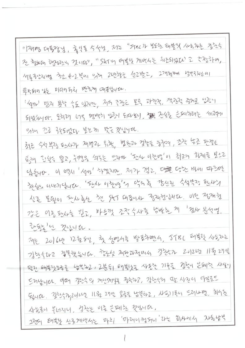 그러나 재판 과정에서 결정적인 추가 조작 증거가 드러납니다. 2012년 6월 12일 태블릿 계약 현장에 김한수가 없었다는게 확인된 것입니다. 김한수가 없었는데 1, 3쪽이 김한수 필적으로 작성되었으니 위조가 확정된 것입니다. 그러자 김한수와 SKT, 검찰은 일제히 8년만에 말을 뒤집고, 김한수가 아닌 다른 사람이 쓴거라는 궤변을 늘어놓았습니다. 그러나 또다른 결정적 증거가 드러납니다.