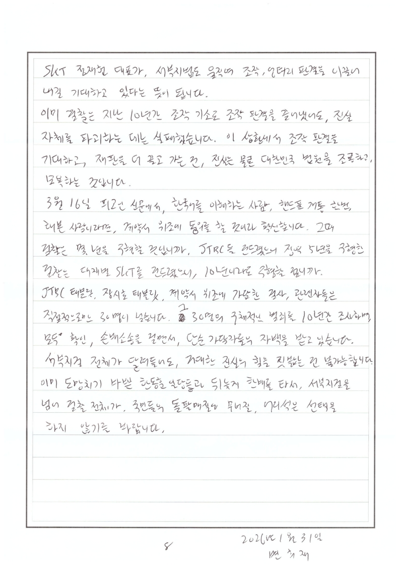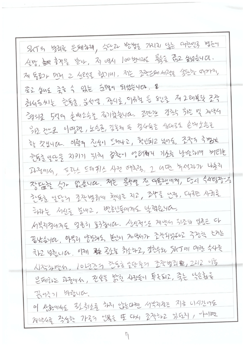 서부지검에게도 엄중히 요구합니다. 상식적으로 계약서 위조의 입증은 다 끝났습니다. 아무리 양보해도 본인이 계약서가 조작되었다고 주장할 근거는 차고 넘칩니다. 이제 공소를 취소하고 김한수와 SKT에 대한 수사를 시작하면서 10여년간의 한동훈 일당들의 조작 범죄, 그리고 이를 은폐하는 과정에서 진실을 밝힌 사람들이 투옥되고 죽는 악순환은 끊어주기 바랍니다.