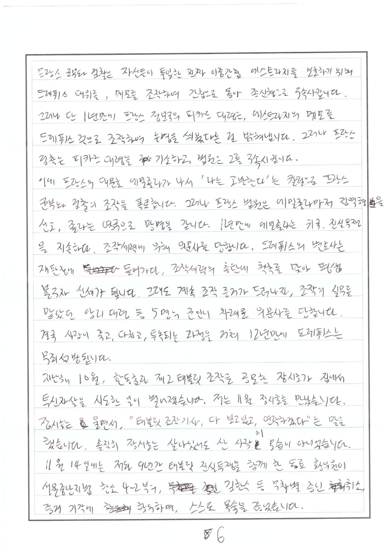 이렇게 진실이 드러나고 확인되고 있어도, 조작의 주범인 한동훈 일당을 지키기 위해 검찰이 엉터리 기소를 남발하며 버티는 과정에서, 프랑스 드레퓌스 사건 때처럼, 그 어떤 희생자가 나올지 장담할 수가 없습니다. 저는 윤석열 전 대통령에게 당시 수사팀장으로 한동훈 일당의 조작 범죄에 책임을 지고 조작을 인정, 대국민 사죄를 하라는 서신을 보내고 변호인들에게도 알렸습니다.