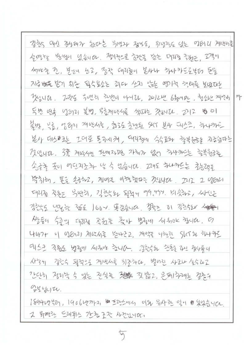 이제와서 부랴부랴 SKT 대리점 직원이 계약서를 쓴 것으로 말을 바꿔봐야, 고객 전화번호도 없고, 3쪽 계약서의 주체인 판매자명도 없고 김한수 대신 김성태가 왔다는 위임자 정보도, 위임장도 없는 엉터리 계약서를 설명할 방법이 없습니다.