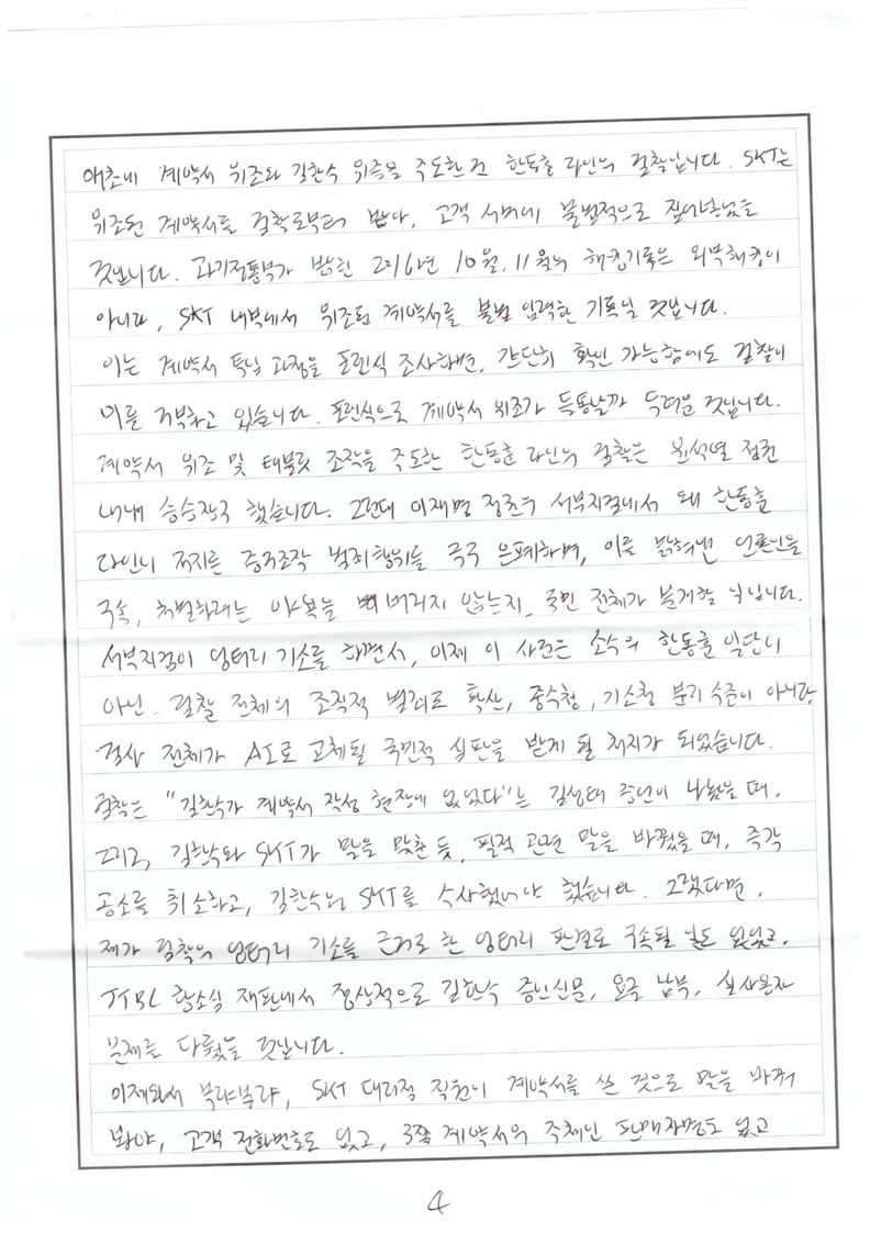 3월 16일 피고인 신문에서 한국어를 이해하는 사람, 핸드폰 개통 한번 해본 사람이라면 계약서 위조에 동의를 할 것이라 확신합니다. 그때 검찰은 몇 년을 구형할 것입니까. JTBC를 건드렸으니 징역 5년을 구형한 검찰은 대재벌 SKT를 건드렸으니 10년이라도 구형할 겁니까.