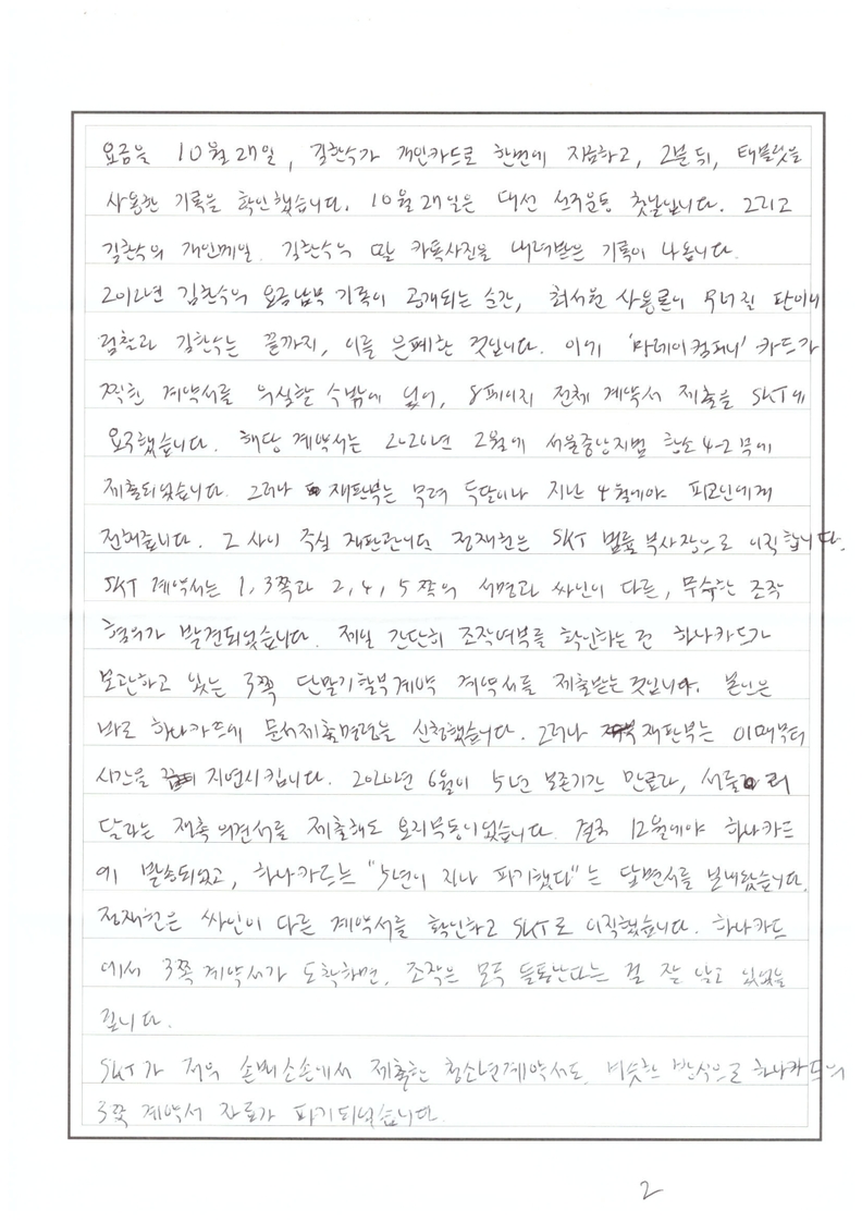 해당 계약서는 2020년 2월에 서울중앙지법 항소4-2부에 제출되었습니다. 그러나 재판부는 무려 두달이나 지난 4월에야 피고인에게 전해줍니다. 그 사이 주심 재판관이었던 정재헌은 SKT 법률 부사장으로 이직합니다. SKT 계약서는 1, 3쪽과 2, 4, 5쪽의 서명과 싸인이 다른, 무수한 조작 혐의가 발견되었습니다.