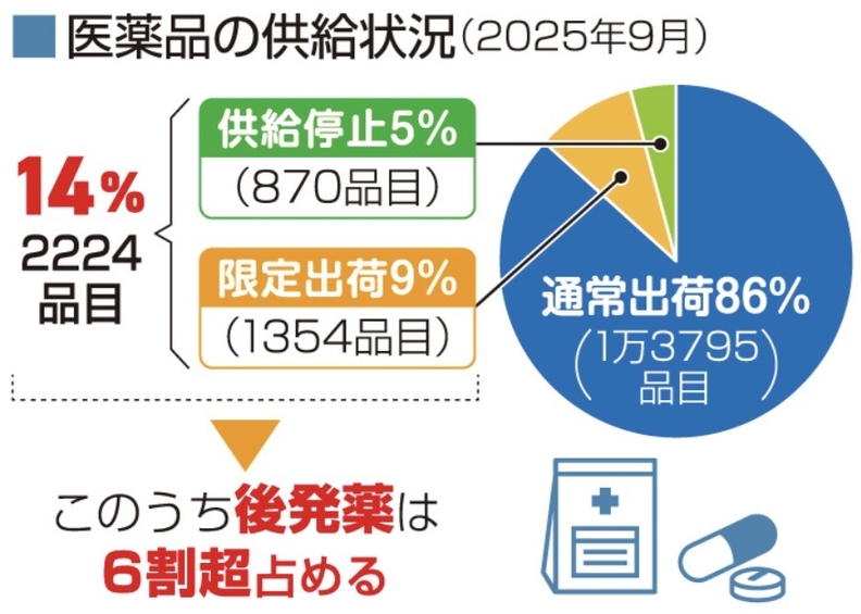 일본 후생노동성의 조사에 따르면, 지난해 9월 기준 일본 내 1만 6019개 의약품 중 2224개(14%)가 경우인 공급 정지(5%)와 제한적 출하(9%)에 해당했다. 이중 제네릭 의약품이 60%가량을 차지한다.