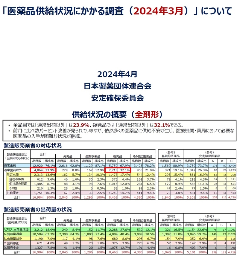 실제로 당시 코트라는 일본제약단체연합회의 조사를 참고했다고 밝히며 “일본 내에서 제조업체가 모든 주문에 응할 수 없는 ‘한정적 공급’, ‘공급 중단’이 된 의약품은 2024년 3월 기준 4064개 품목에 달했다”며 “이는 약가 등재된 전체 의약품의 23.9%며, 제네릭 의약품으로 한정할 경우 32.1%까지 상승한다”고 말했다.
