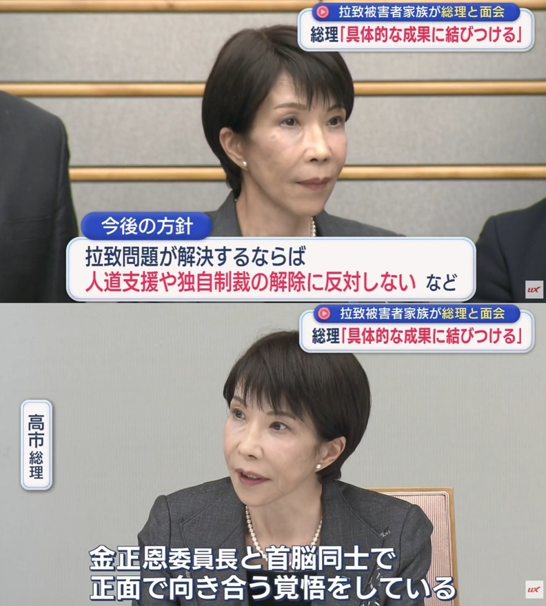 다카이치 총리는 “납치 문제 해결은 내게 주어진 사명이라고 생각한다”며 “김정은 위원장과 정상끼리 정면으로 마주하는 것도 각오하고 있다. 저의 대(代)에서 무엇을 해서라도 돌파구를 열어 구체적 성과로 매듭지어 나가고 싶다”라고 말했다.