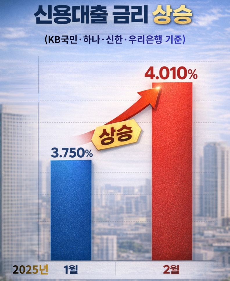 지난 2024년 12월 이후 이들 시중은행의 신용대출 금리 하단은 줄곧 3%대를 유지했지만, 1년 2개월 만에 다시 4%대로 올라섰다. 지난달 16일과 비교하면 하단은 0.260%p, 상단은 0.150%p 상승했다.