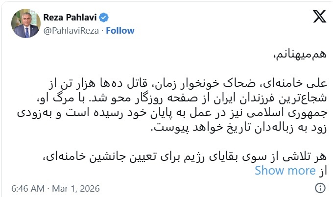 한편, 지난 1979년 이란 이슬람 혁명으로 물러나 현재 미국에 망명 중인 마지막 왕세자 레자 팔라비는 엑스(X)를 통해 하메네이의 죽음을 축하했다.