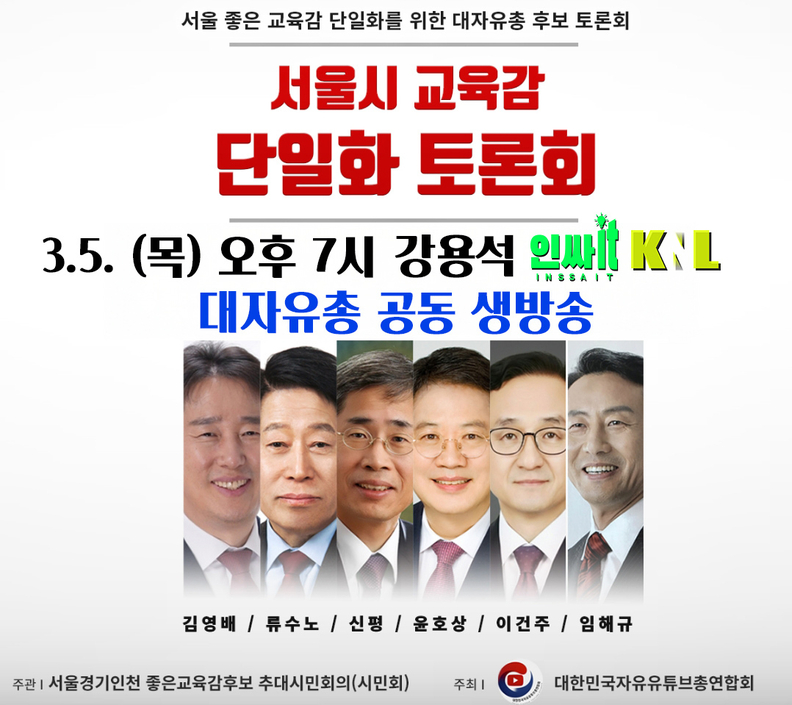 대한민국자유유튜브총연합회(이하 대자유총)는 오는 5일 오후 7시 ‘서울시 교육감 단일화 토론회’를 개최한다고 3일 밝혔다.