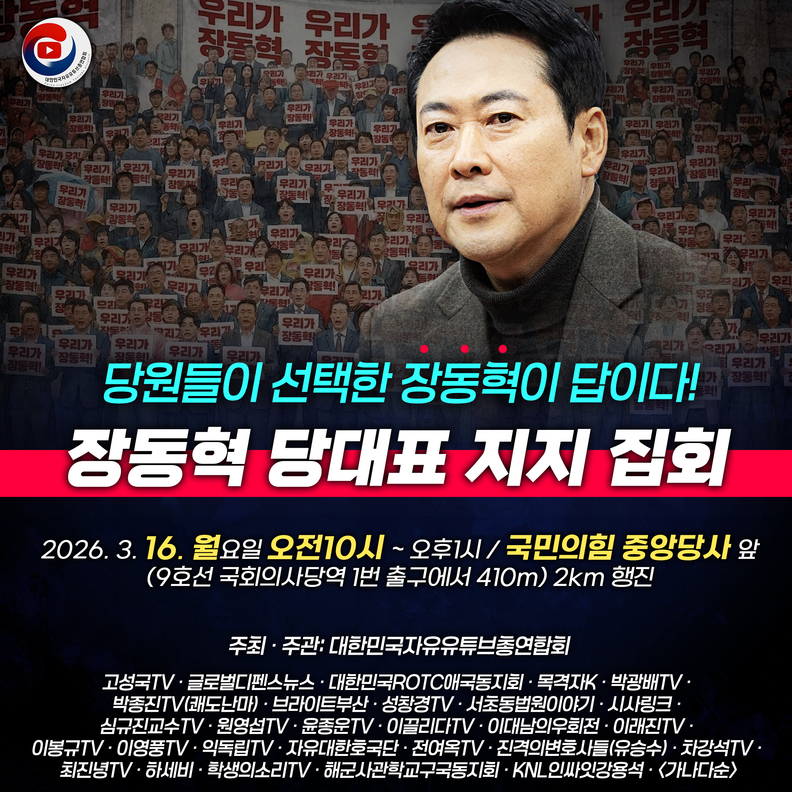 인싸잇=윤승배 기자 | 대한민국 자유유튜브 총연합회(이하 대자유총)가 최근 국민의힘 긴급 의총을 통해 발표된 결의문과 당내 ‘의원 카르텔 정치’를 규탄하는 장외 집회를 개최한다. 이번 집회를 통해 장동혁 국민의힘 당 대표에 더 힘을 실어줄 것으로 보인다.