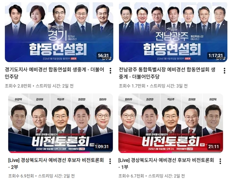 반면 더불어민주당은 유튜브 <델리민주>를 통해 경기지사 예비경선 합동연설회를 생중계하며 약 2.8만 회 조회수를 기록했고, 광주·전남 통합특별시장 연설회 역시 약 1.7만 회를 기록했다.