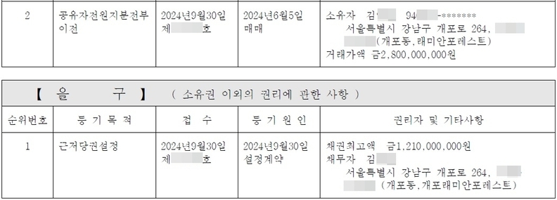 <인싸잇>이 확보한 김 씨 소유의 아파트(개포동 래미안블레스티지)의 등기부등본에 의하면, 그는 지난 2024년 6월 전용면적 84.943㎡를 28억 원에 계약해 그해 9월 등기 이전을 완료했다.