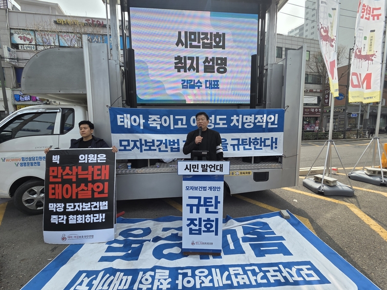 연단에 선 김길수 생명운동연합 대표는 “은평구의 박주민 국회의원이 발의한 ‘모자보건법 개정안’의 공익적 절박함 때문에 이 자리에 섰다”고 집회의 취지를 설명했다.