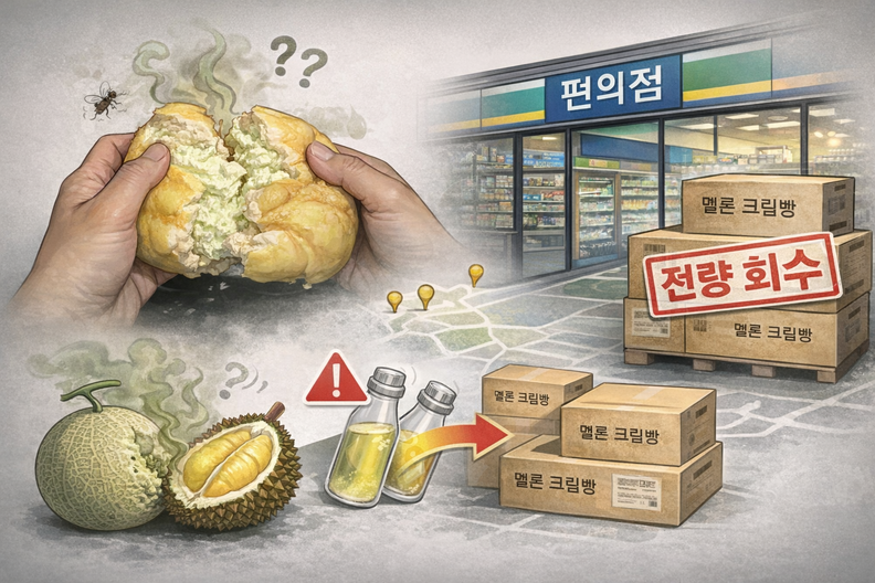 인싸잇=백소영 기자 ㅣ 편의점에서 판매된 멜론 크림빵에서 악취가 난다는 소비자 민원과 온라인 상에서 후기가 잇따르자 업체는 약 2만 개 물량을 전량 회수에 나섰다. 제조 과정에서 두리안 향료가 혼입된 사실이 확인되며 관리에도 문제제기가 되고 있다.