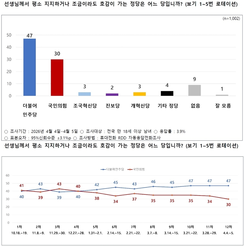 직전 조사인 지난달 28~29일 결과보다 민주당은 변화가 없었고, 국민의힘은 4%p 하락했다. 각 40%로 동률이었던 지난해 12월 27~28일 이후 8차례 진행한 조사에서 모두 민주당이 국민의힘을 앞서고, 그 격차가 3월에 이어 더 벌어지는 모양새다.