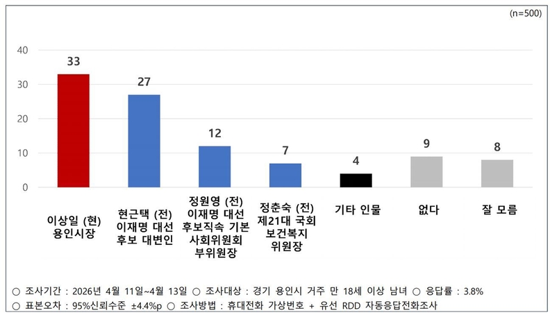 인싸잇경기가 한국여론평판연구소(KOPRA)에 의뢰해 지난 11~13일 경기도 용인시 거주 만 18세 이상 남녀 500명을 대상으로 실시한 선거 여론조사 결과, 차기 용인시장으로 가장 적합한 인물로 이상일 현 용인시장이 33%로 1위를 차지했다. 이어 현근택 전 이재명 대선후보 대변인(27%), 정원영 전 이재명 대선 후보직속 기본사회위원회 부위원장(12%), 정춘숙 전 제21대 국회 보건복지위원장(7%) 순이었다. ‘기타 인물’은 4%, ‘없다’는 9%, ‘잘 모름’은 8%였다.