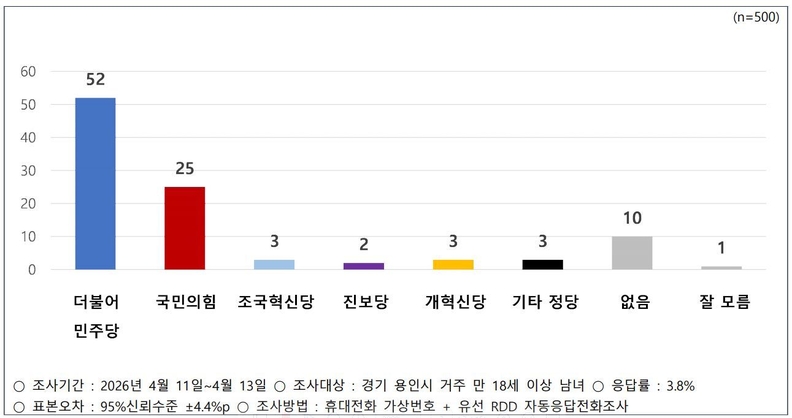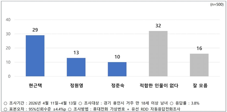 이 조사는 인싸잇경기가 한국여론평판연구소(KOPRA)에 의뢰해 2026년 4월 11~13일 경기도 용인시 만 18세 이상 남녀 500명을 대상으로 무선 가상번호(92%)와 유선 RDD(8%)를 이용한 ARS조사 방식으로 진행했다. 응답률은 3.8%(1만 3093명 중 500명)이며, 2026년 3월 말 행정안전부 주민등록인구 기준으로 성별, 연령대별, 지역별 가중값을 부여했고, 표본오차는 95% 신뢰수준에 ±4.4%p다. 자세한 내용은 중앙선거여론조사심의위원회 홈페이지에서 확인할 수 있다.
