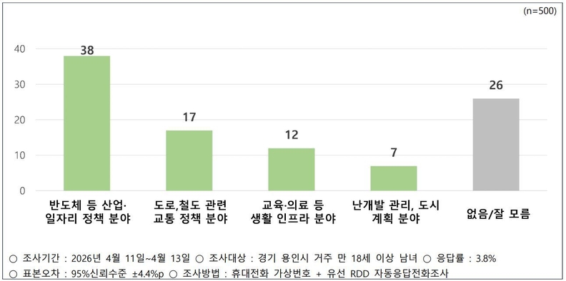 불만족 분야에서는 ‘난개발 관리, 도시계획 분야’가 31%로 1위였다. ‘도로·철도 관련 교통 정책 분야’(23%), ‘교육·의료 등 생활 인프라 분야’(16%), ‘반도체 등 산업·일자리 정책 분야’(16%) 순이었고, ‘없음·잘 모름’은 6%에 그쳤다. 50대(37%)에서 난개발·도시계획 불만족 비율이 가장 높았으며, 처인구(31%)에서는 교통 분야 불만이 두드러졌다.