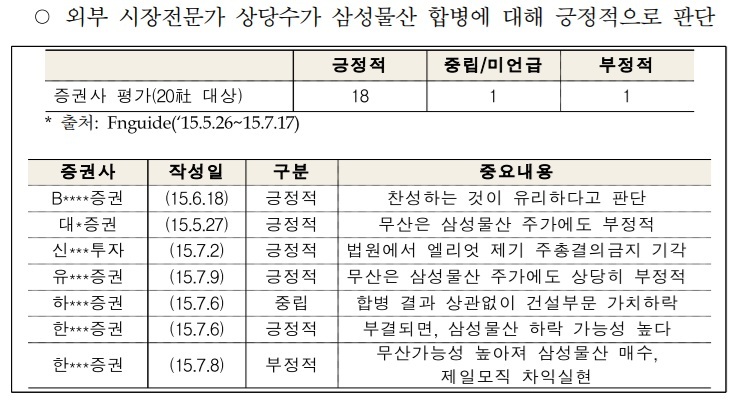 국민연금은 해당 보도자료에서 당시 제일모직-삼성물산 합병 의결권 행사에 앞서 “외부 시장전문가 상당수가 삼성물산 합병에 대해 긍정적으로 판단한 점을 고려했다”라는 취지로, 20개 증권사 중 18곳이 합병에 긍정적으로 평가했다는 점을 들었다.