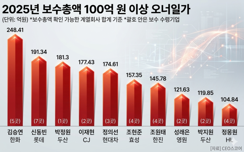 5억 원 이상의 보수를 받은 132의 오너일가 중 보수 총액이 100억 원 이상인 인물은 10명으로 조사됐다. 이중 보수가 가장 많은 인물은 김승연 한화그룹 회장으로, 김 회장은 지난해 한화그룹 5개 계열사에서 총 248억 4100만 원을 수령했다.
