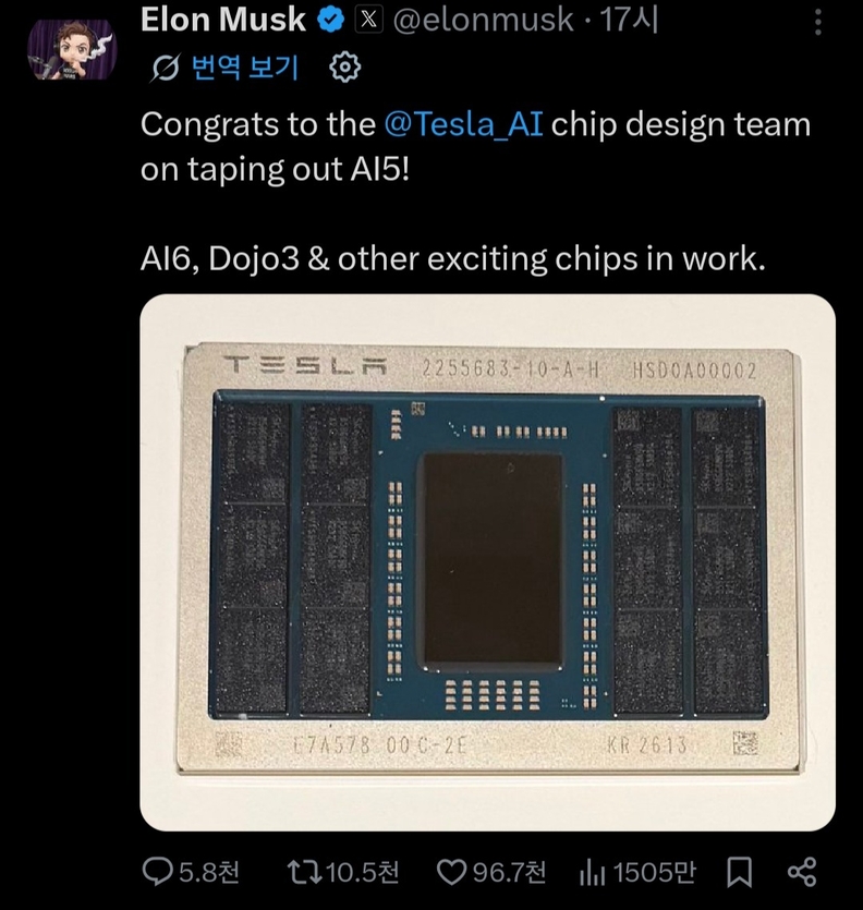머스크는 15일(현지시간) 자신의 엑스(X)에 “테슬라 AI 칩 디자인 팀의 AI5 테이프 아웃을 축하한다”며 “AI6과 도조3, 그 외에 멋진 칩들이 개발 중”이라고 말했다.
