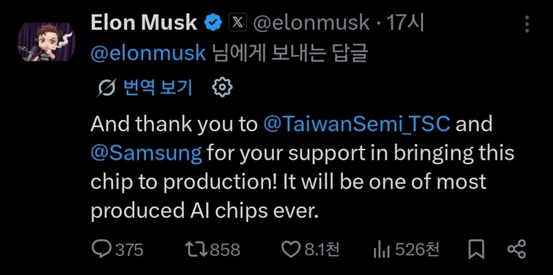그러면서 머스크는 이 게시글의 댓글에 “이 칩을 생산할 수 있도록 도와준 삼성전자와 TSMC에도 감사한다”고 강조했다.