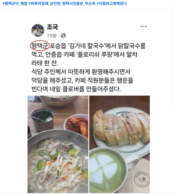 조국 대표는 지난 15일 자신의 페이스북에 “평택군 포승읍 ‘김가네 칼국수’에서 닭칼국수를 먹고, 안중읍 카페 ‘플로리쉬 루팡’에서 말차 라테 한 잔을 마셨다”라는 글과 함께 사진을 게시했다.