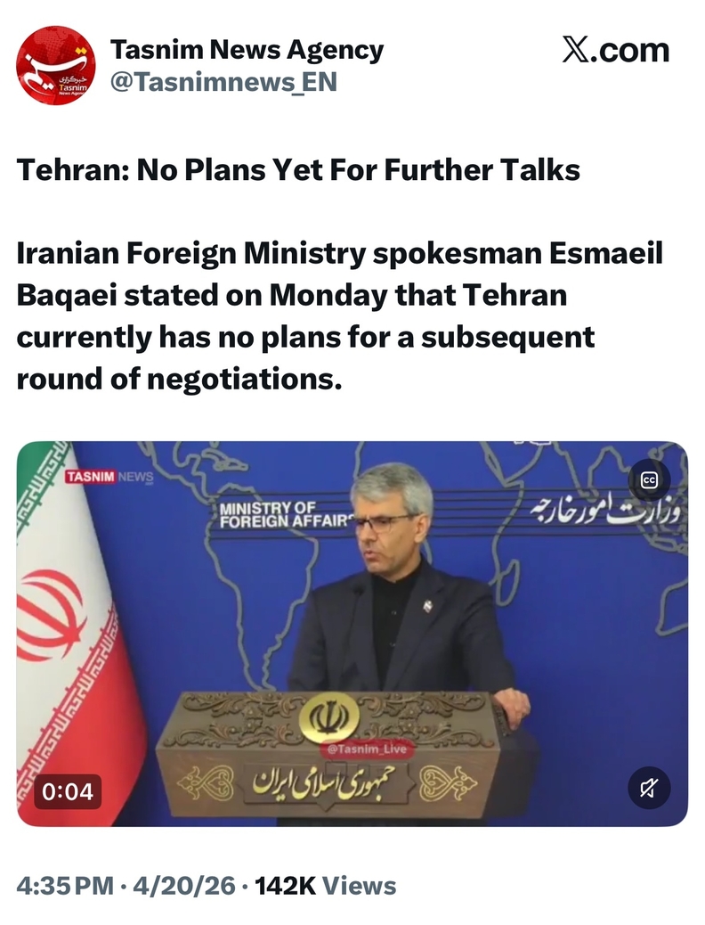 이란 외무부 대변인 에스마일 바가이는 이날 기자회견에서 “현재로서 차기 협상에 대한 계획이 없고 어떤 결정도 내려지지 않았다”고 밝혔다. 그는 미국이 “외교 프로세스 추진에 진정성이 없음을 행동으로 드러내고 있다”며 “말과 행동 사이의 명백한 모순이 미국의 의도에 대한 이란 국민의 불신을 심화시킨다”고 말했다. 이란 국영통신 IRNA는 이란의 불참 이유로 “미국의 과도한 요구, 비현실적인 기대, 끝없는 입장 변화, 반복되는 모순, 미 해군의 지속적인 봉쇄”를 들었다.